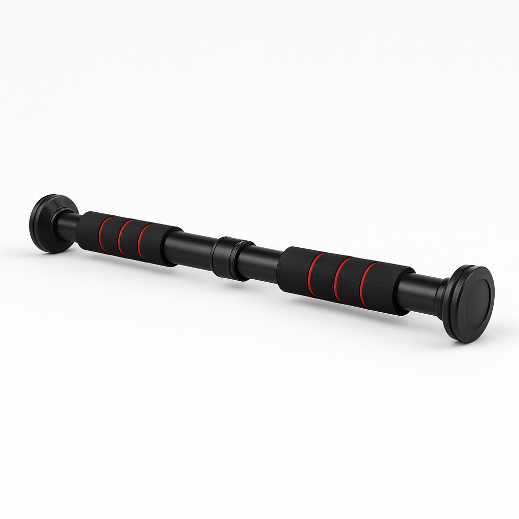 A sturdy and adjustable pull-up bar designed for easy installation on standard door frames — no screws or drilling required. Built from high-grade carbon steel, the bar features anti-slip silicone grips and a telescopic tension system that allows secure mounting between 65 and 95 cm width.