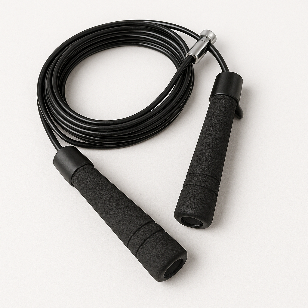 Adjustable jump rope with PVC-coated steel cable. Length: 3 meters, easily customizable with screw locks. Handles: 14 cm with non-slip rubber grip. Ball bearing system ensures smooth rotation. Ideal for cardio, HIIT, and boxing training.