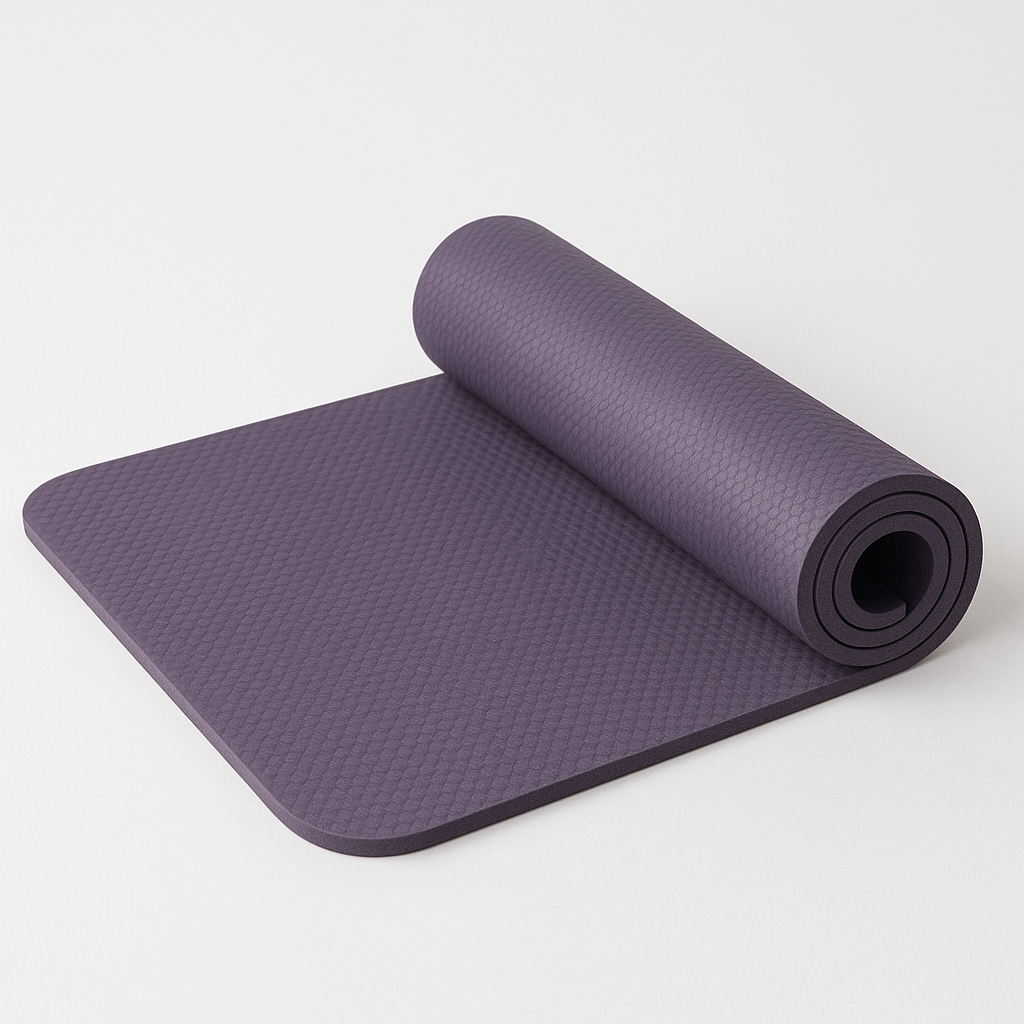 Eco-friendly TPE yoga mat with non-slip textured surface. Dimensions: 183 x 61 cm, thickness 6 mm. Lightweight (900 g) yet durable, resistant to tearing and sweat. Rolls easily for transport. Suitable for yoga, pilates, and floor workouts.